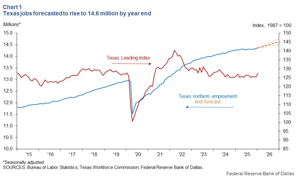 The headline number: The Dallas Fed projects Texas will add 280,000 jobs in 2026 — a 1.9% growth rate and a meaningful upgrade from February's forecast. Two strong months drove the revision: annualized growth of 2.3% in January and 2.2% in December, with Dallas clocking 4.8% in January alone.