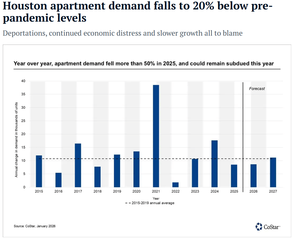 Houston apartment demand has dropped to 20% below pre-pandemic levels, driven by economic strain, slower growth, and rising deportations, according to CoStar.